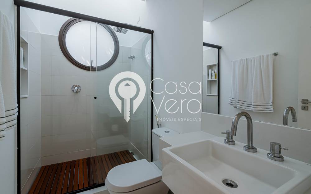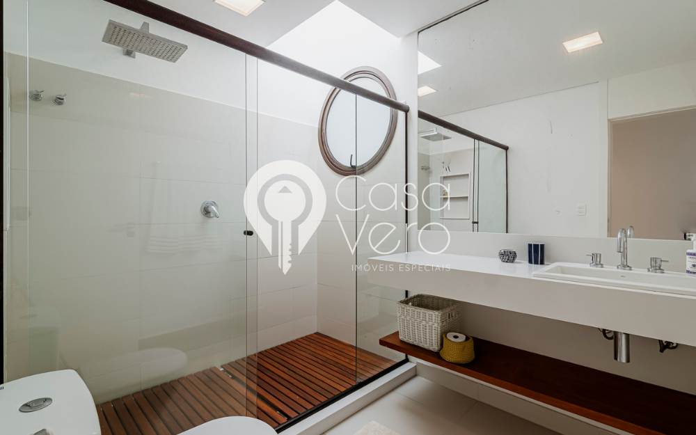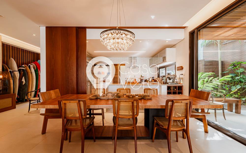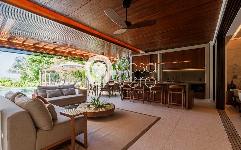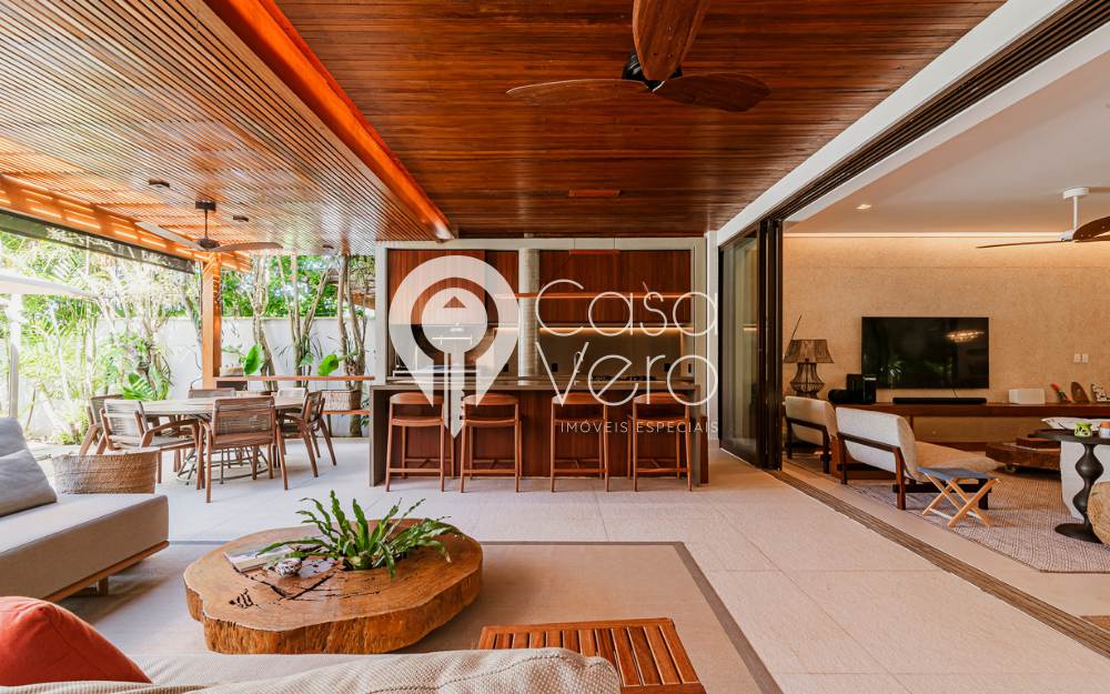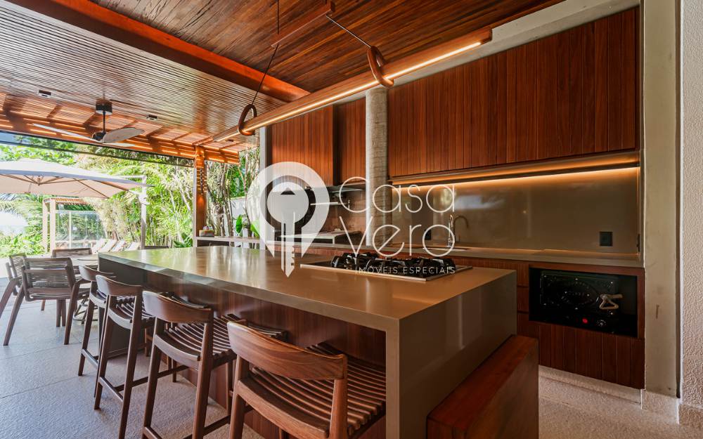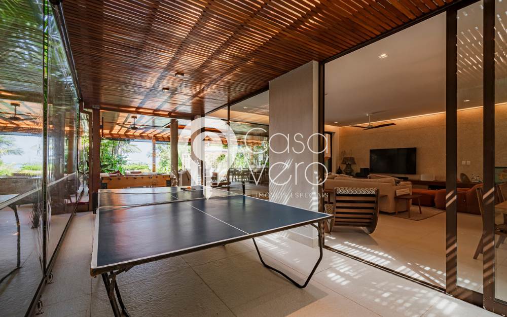 Para o lazer, além da praia que é a estrela local e o serviço oferecido pelo condomínio para comodidade, a casa oferece área gourmet com churrasqueira e piscina, ambas privativas, sauna e hidromassagem.