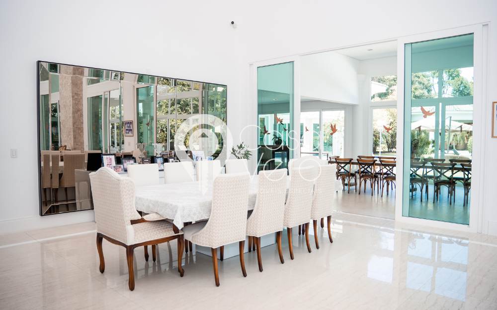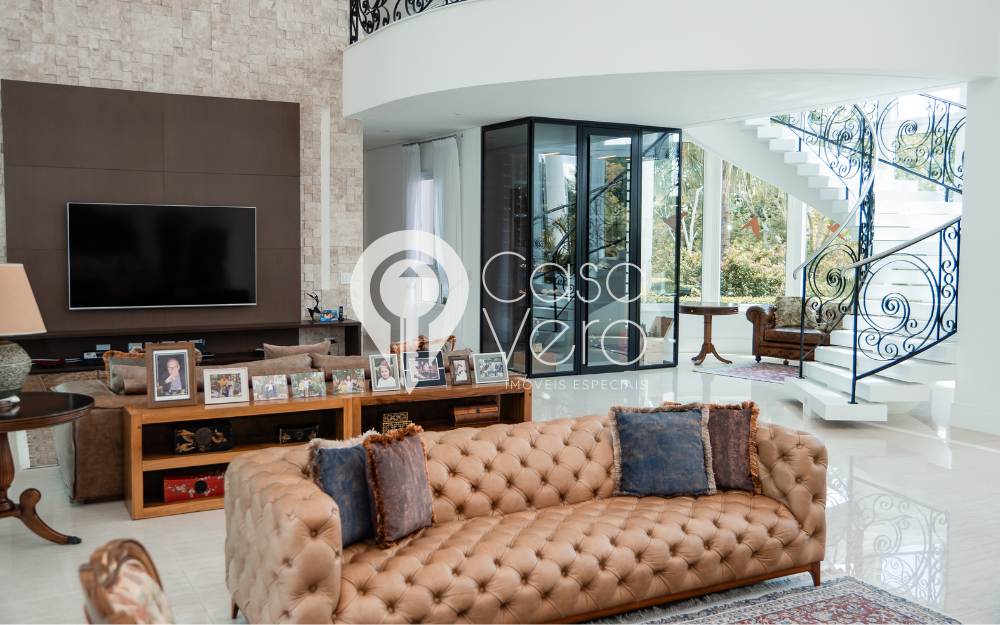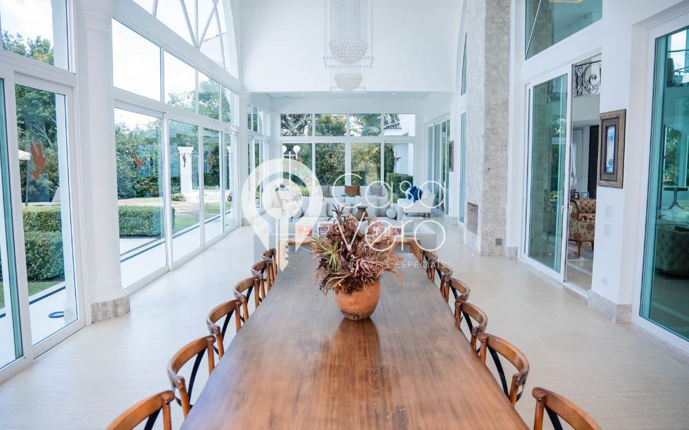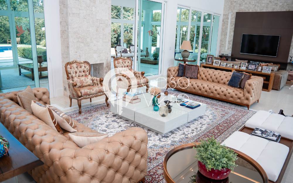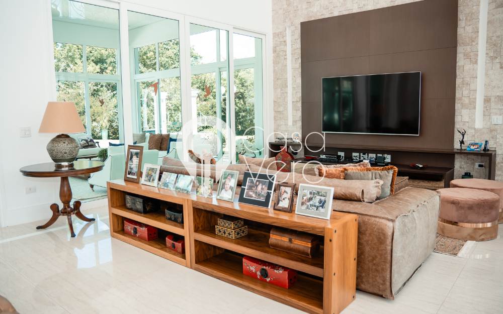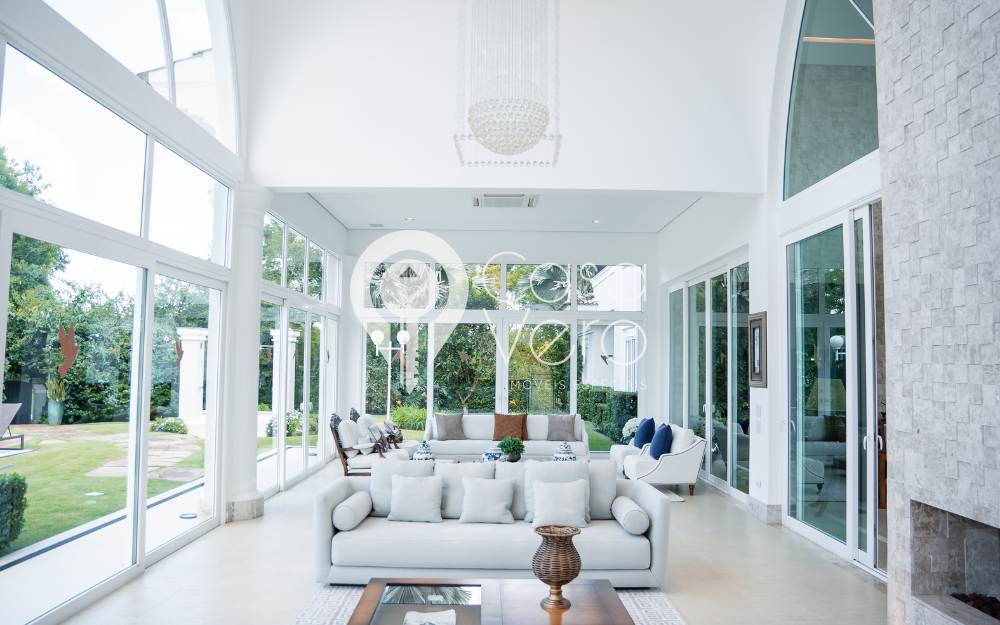 No térreo, ampla sala para 3 ambientes, pé direito duplo, com adega, integrada ao terraço gourmet com fechamento em portas de vidro, proporcionando conforto em todos os momentos, inclusive no inverno. Cozinha e área de serviço completas, dependências externas para funcionários e casa de caseiros.