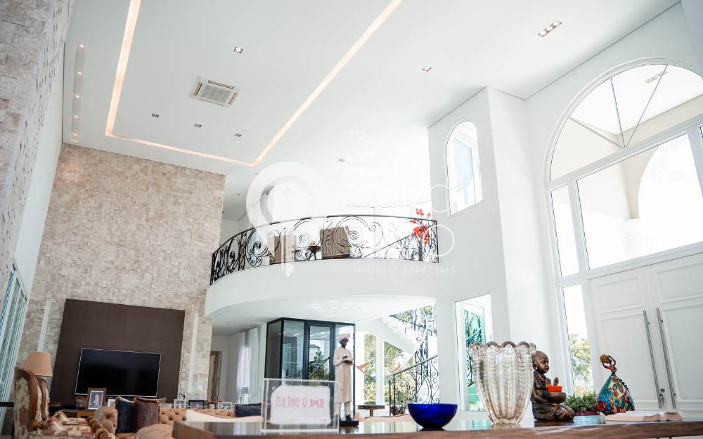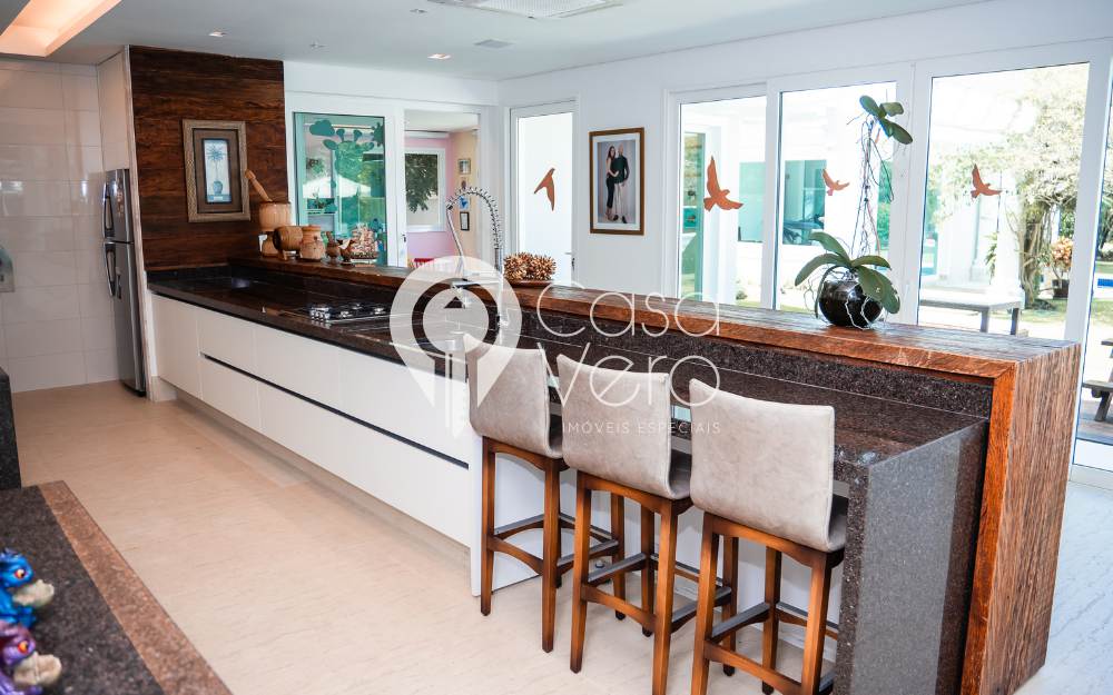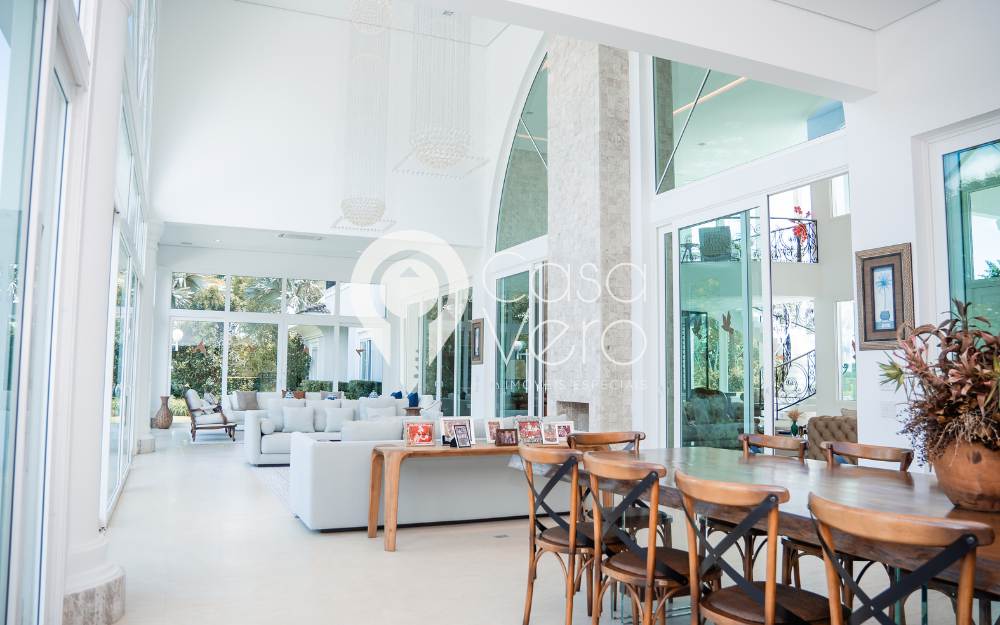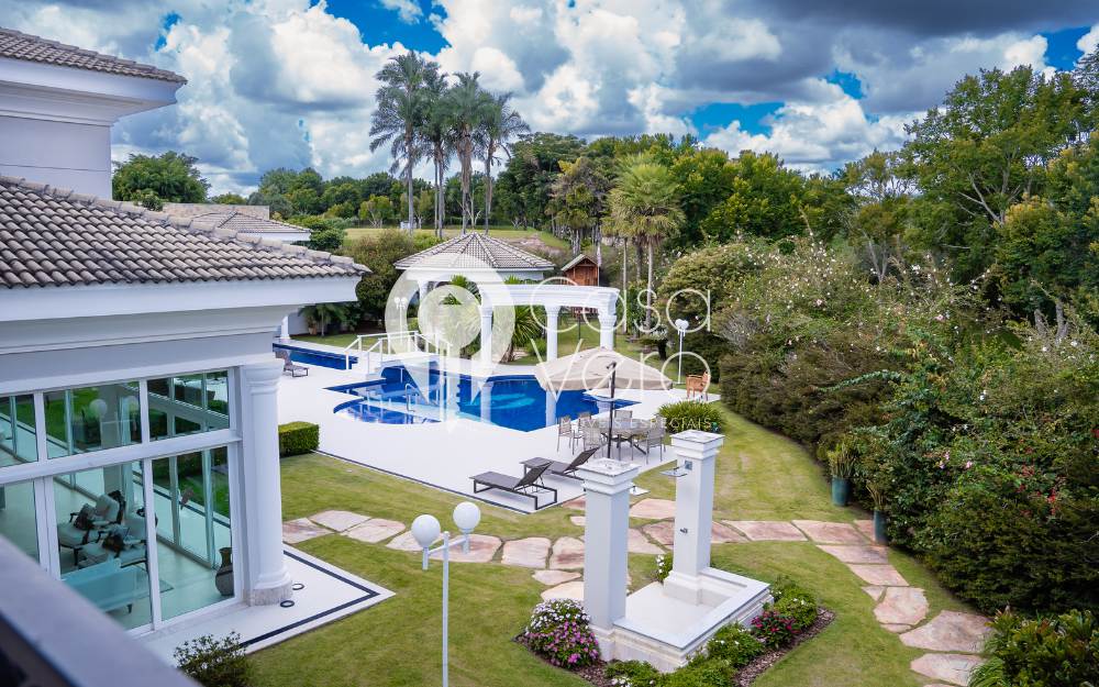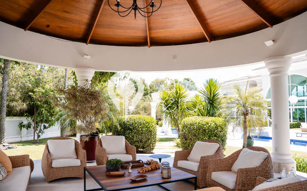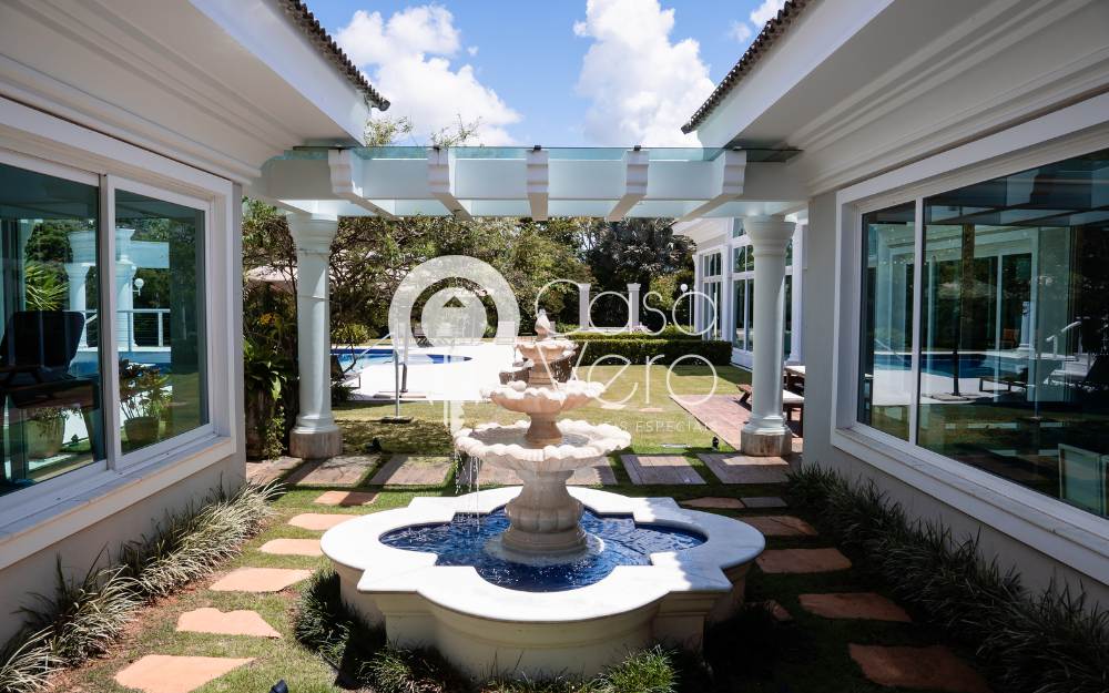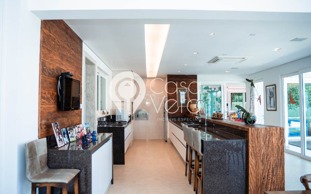 A casa possui 5 suítes, sendo 4 no térreo e a suíte master no superior, com elevador para acesso à suíte master. A área de lazer externa conta com piscina, sauna, brinquedoteca e um charmoso gazebo para descanso.