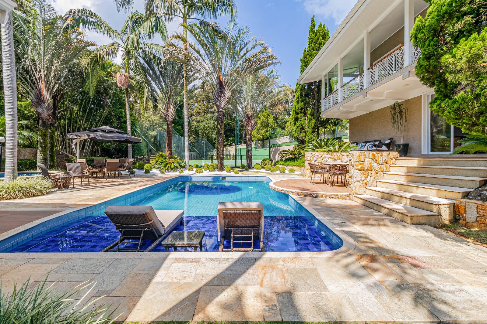 * Varanda 360° com vista para piscina, espaço gourmet e quadra de tênis