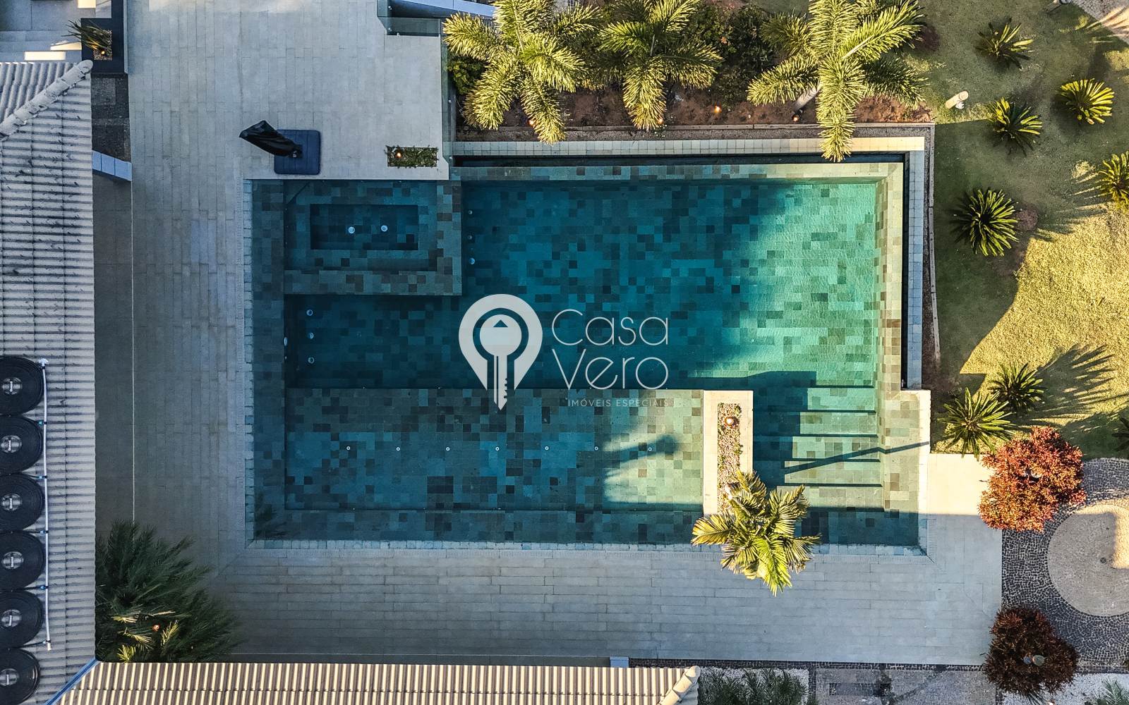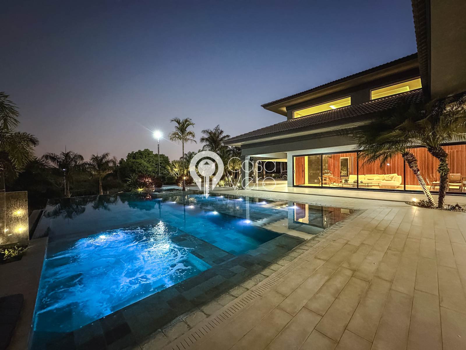 * Piscina com borda infinita em pedra hijau, SPA integrado, cascata e tratamento a sal/ozônio.