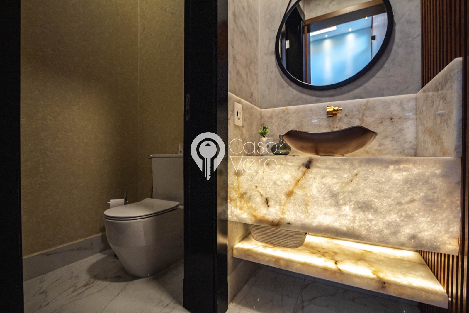 * 6 banheiros, lavabo em pedra ônix translúcida.