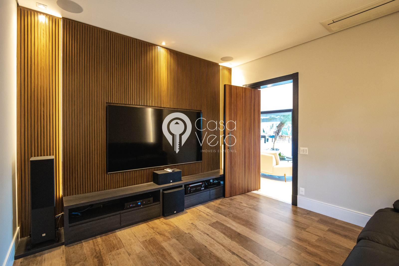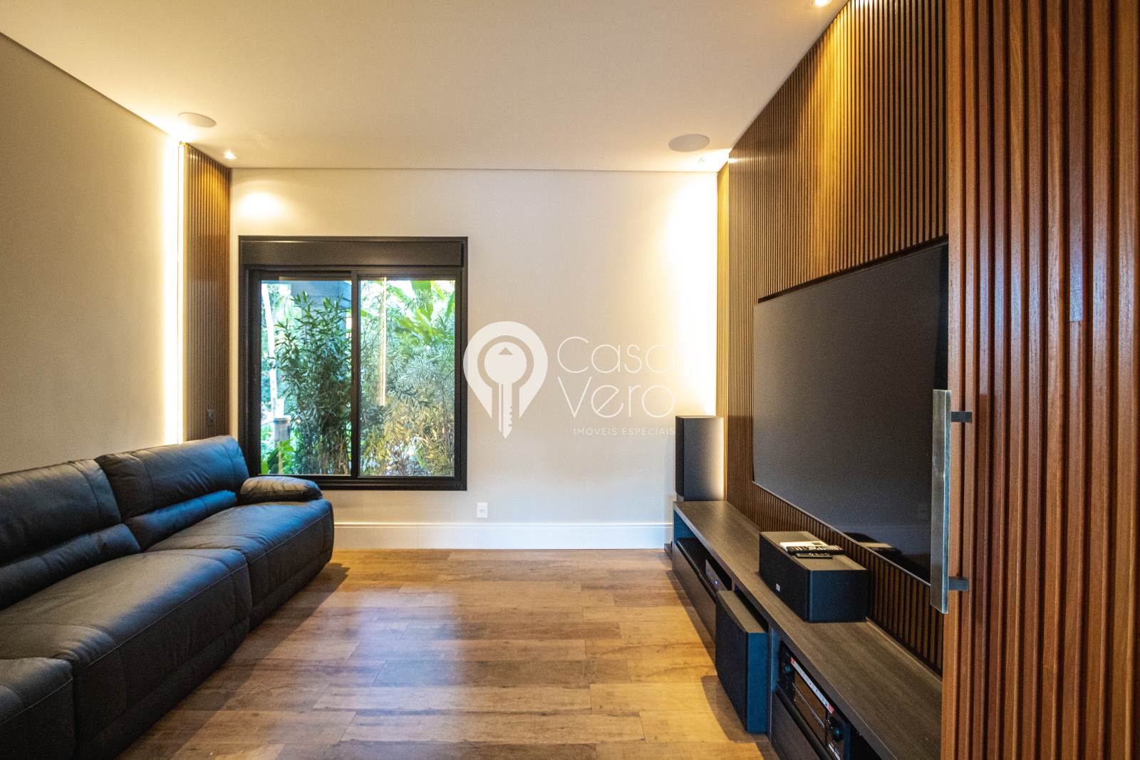 * Cinema privativo com sofás elétricos Natuzzi, sistema Dolby Atmos e TV Samsung QLED 85”.