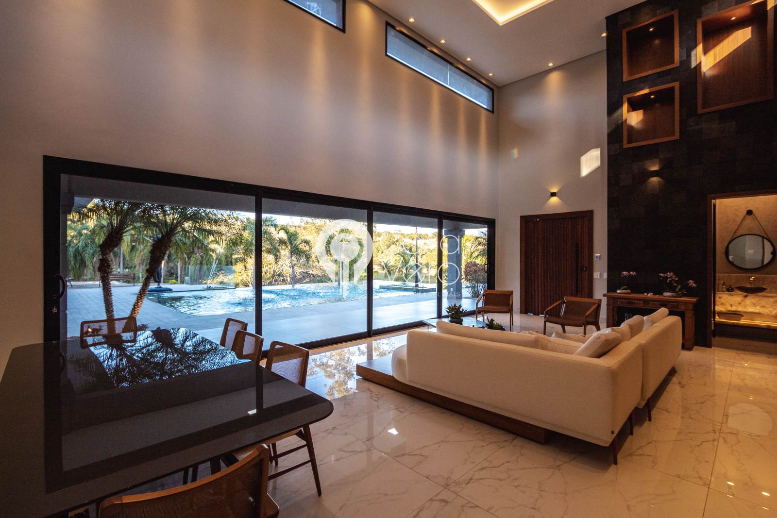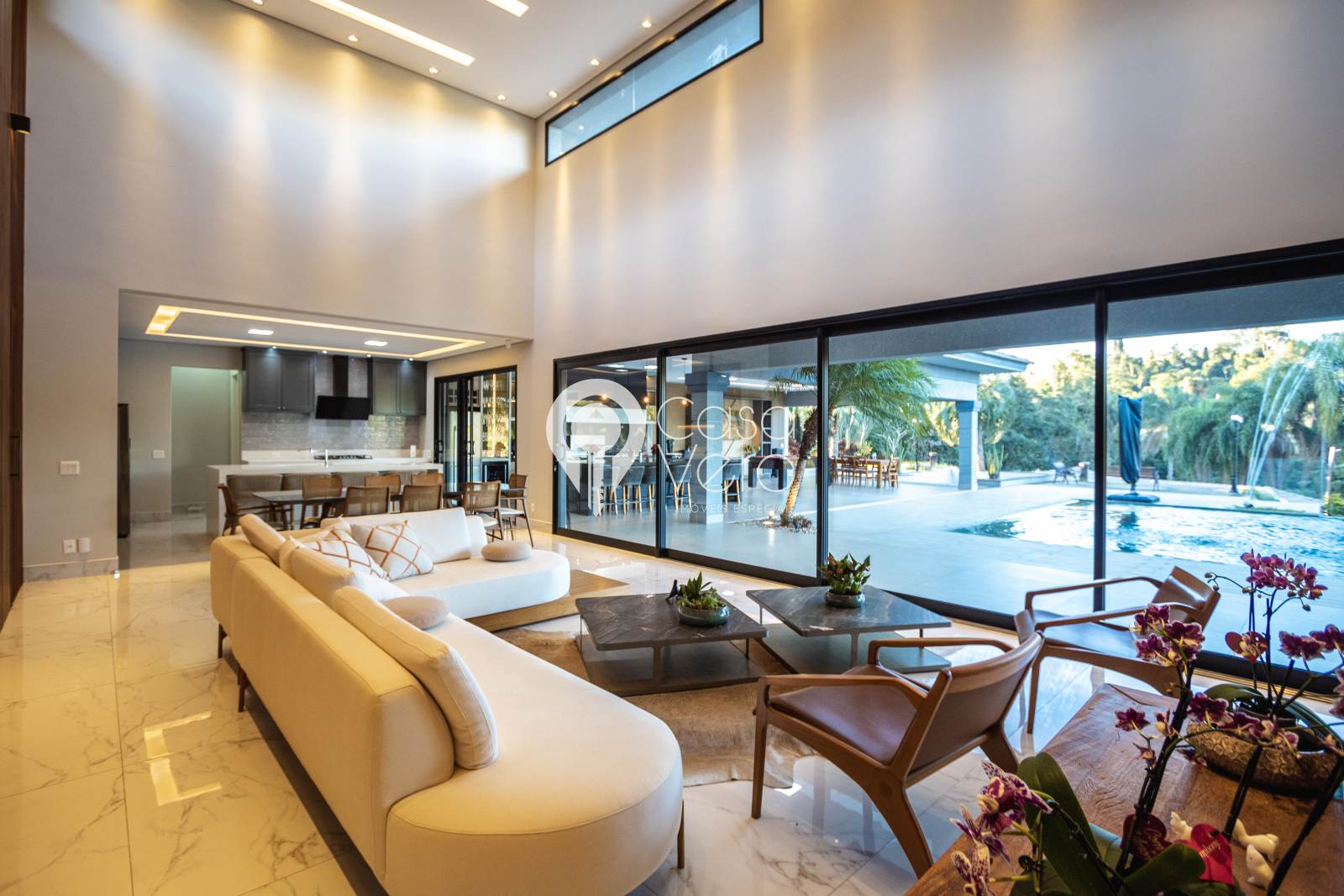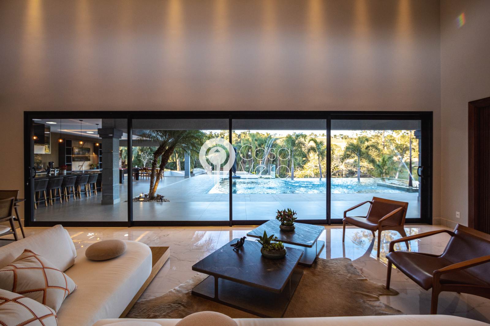* Sala principal com pé-direito de 7m, integrando madeira e pedra natural.
