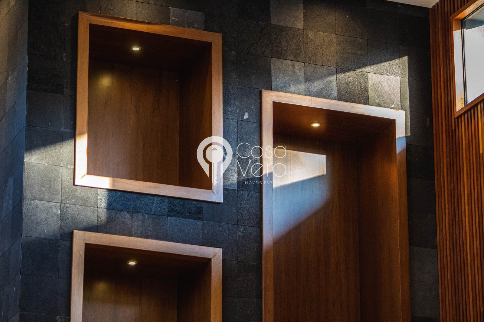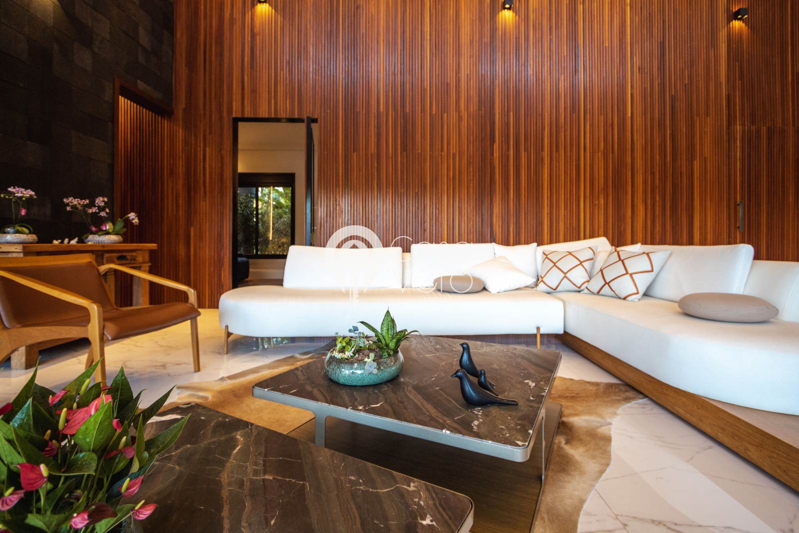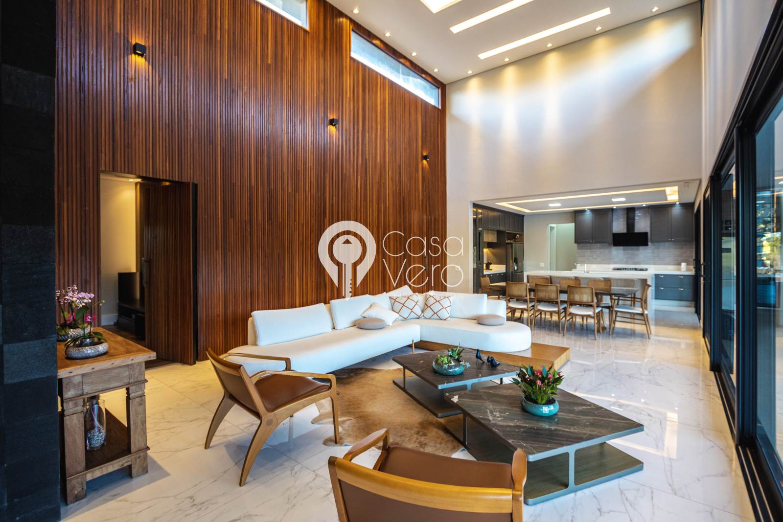 * Sala principal com pé-direito de 7m, integrando madeira e pedra natural.